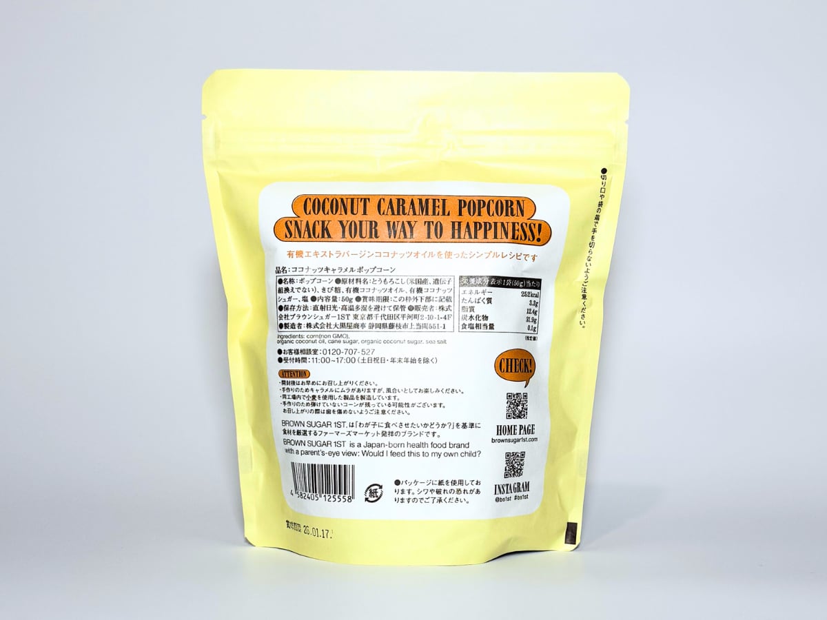 有機エキストラバージンココナッツオイルと有機ココナッツシュガー、とうもろこし豆(遺伝子組換えでない)、喜界島のきび糖、塩だけを使ったシンプルレシピです。安心・安全な原料にこだわり、子どもたちにも安心して食べさせられるお菓子に仕上げています。